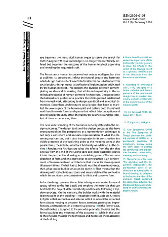 The new understanding of the human is not only diffused in the de- sign outcomes. The design tools and the design processes also have strong symbolism. The perspective, as a representation technique, is not only a consistent and accurate representation of what the ob- serving eye can see, but it also incorporates in its construction the visible presence of the vanishing point as the meeting point of the parallel lines, the infinite, what for Christianity was defined as the di- vine 8 Renaissance Architecture takes the infinite from the sky, that is to say from the end of the Gothic spire and iconoclastically locates it into the perspective drawing as a vanishing point 9 The accurate depiction of form and enclosure prior to construction is an achieve- ment of human-centered architecture that marks its development till present times. If what has to be built must be drawn in advance, then what can be built is what can be drawn 10 That means that the drawing with its techniques, tools, and means defines the context in which the architects are constrained to think and conceive form.