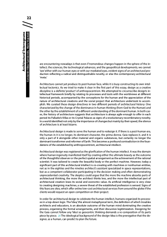 Architecture cannot yet produce its post-human face, while it is busy constructing its own intel- lectual tectonics. As we tried to make it clear in the first part of this essay, design as a creative discipline is a definite ‘product’ of anthropocentrism. We attempted to circumscribe design’s in- tellectual framework briefly by relating its processes and tools with the worldviews at different historical periods, accompanied by the conceptions for the human and the appreciation of the nature of architectural creations and the social project that architecture undertook to accom- plish. We curated these design directives in two different periods of architectural history: One characterized by the change of the dominance in human thinking (from God to the Human) and the other by the establishment of a different understanding of the dominant human. In both cas- es, the history of architecture suggests that architecture is always agile enough to offer in each period its Palladio’s Villas or its Crystal Palaces as signs of a revolutionary recombinatory novelty. In a world identified not only by the importance of changes but mainly by their speed, the silence of architecture is at least bizarre.