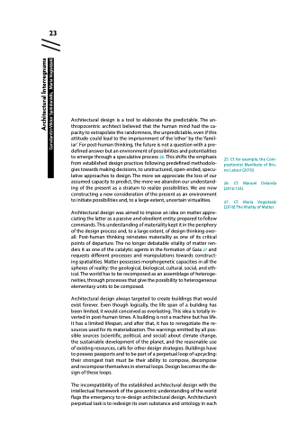 Architectural design is a tool to elaborate the predictable. The an- thropocentric architect believed that the human mind had the ca- pacity to extrapolate the randomness, the unpredictable, even if this attitude could lead to the imprisonment of the ‘other’ by the ‘famil- iar’. For post-human thinking, the future is not a question with a pre- defined answer but an environment of possibilities and potentialities to emerge through a speculative process 26. This shifts the emphasis from established design practices following predefined methodolo- gies towards making decisions, to unstructured, open-ended, specu- lative approaches to design. The more we appreciate the loss of our assumed capacity to predict, the more we abandon our understand- ing of the present as a stratum to realize possibilities. We are now constructing a new consideration of the present as an environment to initiate possibilities and, to a large extent, uncertain virtualities.