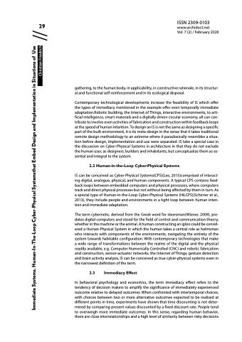 Contemporary technological developments increase the feasibility of IS which offer the types of immediacy mentioned in the example offer even temporally immediate adaptation.Robotic building, the Internet of Things, interactive environments, to arti- ficial intelligence, smart materials and a digitally driven circular economy, all can con- tribute to involve even activities of fabrication and construction within feedback loops at the speed of human intention. To design an IS is not the same as designing a specific part of the built environment, it is its meta-design in the sense that it takes traditional remote design methodology to an extreme where it paradoxically resembles a situa- tion before design, implementation and use were separated. IS take a special case in the discussion on Cyber-Physical Systems in architecture in that they do not exclude the human user, as designers, builders and inhabitants, but conceptualize them as es- sential and integral to the system.