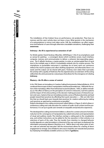 For British painter David Hockney (Weschler, 2009)(Figure 1) the IS isa smartphone used as canvas for painting – a convergent device which combines screen, touch interface, computer, memory and communication to deliver a coherent, fast-responding experi- ence. The IS affords Hockney, a master-painter, to enter an uninterrupted flow of work due to the multiple ways in which it immediately embeds into his creative process. The smartphone as pocketable instrument it canalways be at hand, work can commence without the need to prepare and collect drafting equipment, and afterwards there is no waste and the output can be shared with peers. Hockney even states that it pervades the activity with a quality of freshness.The ISis experienced as an extension of the acting selfand lets the artist proceed at a natural pace that allows for the emergence of a feeling intimacy.