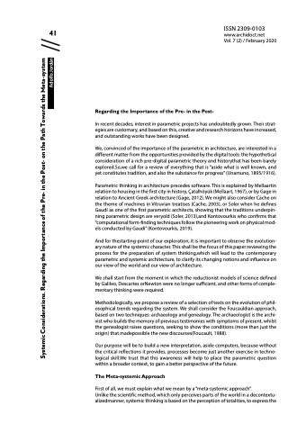 And for thestarting-point of our exploration, it is important to observe the evolution- ary nature of the systemic character. This shall be the focus of this paper:reviewing the process for the preparation of system thinking,which will lead to the contemporary parametric and systemic architecture, to clarify its changing notions and influence on our view of the world and our view of architecture.