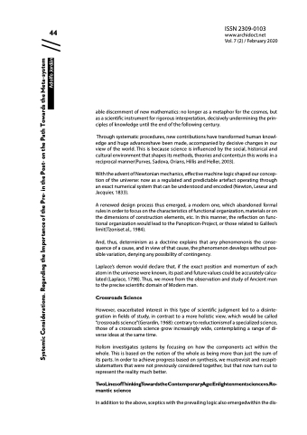 However, exacerbated interest in this type of scientific judgment led to a disinte- gration in fields of study, in contrast to a more holistic view, which would be called “crossroads science”(Gerardin, 1968): contrary to reductionismof a specialized science, those of a crossroads science grow increasingly wide, contemplating a range of di- verse ideas at the same time.