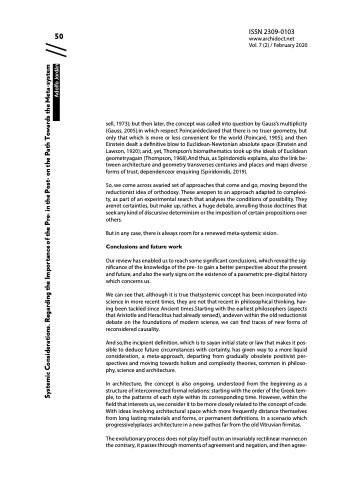 sell, 1973); but then later, the concept was called into question by Gauss’s multiplicity (Gauss, 2005);in which respect Poincarédeclared that there is no truer geometry, but only that which is more or less convenient for the world (Poincaré, 1905); and then Einstein dealt a definitive blow to Euclidean-Newtonian absolute space (Einstein and Lawson, 1920); and, yet, Thompson’s biomathematics took up the ideals of Euclidean geometryagain (Thompson, 1968).And thus, as Spiridonidis explains, also the link be- tween architecture and geometry transverses centuries and places and maps diverse forms of trust, dependenceor enquiring (Spiridonidis, 2019).