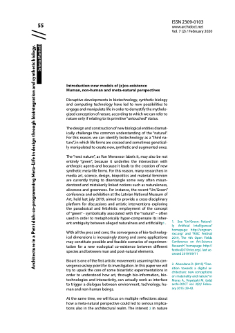 The “next nature”, as Van Mensvoor labels it, may also be not entirely “green”, because it underlies the intersection with anthropic agents and because it leads to the creation of new synthetic meta-life forms. For this reason, many researchers in media art, science, design, biopolitics and material feminism are currently trying to disentangle some very often misun- derstood and mistakenly linked notions such as naturaleness, aliveness and greenness. For instance, the recent “Un/Green” conference and exhibition at the Latvian National Museum of Art, held last july 2019, aimed to provide a cross-disciplinary platform for discussions and artistic interventions exploring the paradoxical and fetishistic employment of the concept of “green” - symbolically associated with the “natural” – often used in order to metaphorically hyper-compensate its inher- ent ambiguity between alleged naturalness and artificiality1 .