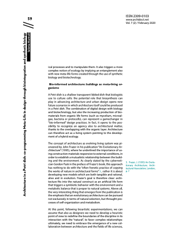 The concept of architecture as evolving living system was pi- oneered by John Frazer in his publication “An Evolutionary Ar- chitecture” (1995), where he underlined the importance of us- ing construction materials responsive to external conditions, in order to establish a mutualistic relationship between the build- ing and the environment. As clearly stated by the cyberneti- cian Gordon Pask in the preface of Frazer’s book, this approach has nothing to do with the “often frenetic practice of copying the works of nature in architectural forms” 3 , rather it is about developing new models which are both tangible and rational, alive and in evolution. Frazer’s goal is therefore clear: archi- tecture fits into the natural construct as an artificial life form that triggers a symbiotic behavior with the environment and a metabolic balance that is proper to natural systems. Above all, the very interesting thing that emerges from the publication is the emphasis that an evolutionary architecture can be pursued not exclusively in terms of natural selection, but throught pro- cesses of self-organization and metabolism.