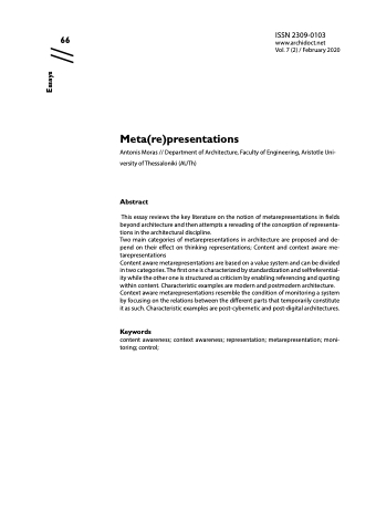 Content aware metarepresentations are based on a value system and can be divided in two categories. The first one is characterized by standardization and selfreferential- ity while the other one is structured as criticism by enabling referencing and quoting within content. Characteristic examples are modern and postmodern architecture. Context aware metarepresentations resemble the condition of monitoring a system by focusing on the relations between the different parts that temporarily constitute it as such. Characteristic examples are post-cybernetic and post-digital architectures.