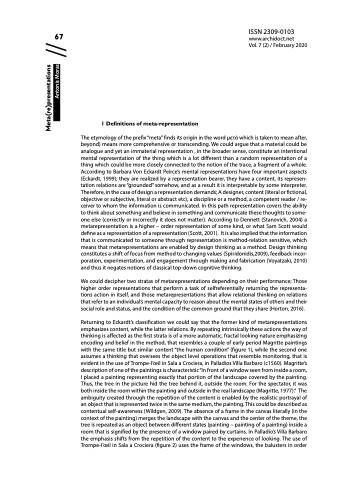 The etymology of the prefix “meta” finds its origin in the word μετά which is taken to mean after, beyond) means more comprehensive or transcending. We could argue that a material could be analogue and yet an immaterial representation , in the broader sense, constitute an intentional mental representation of the thing which is a lot different than a random representation of a thing which could be more closely connected to the notion of the trace, a fragment of a whole. According to Barbara Von Eckardt Peirce’s mental representations have four important aspects (Eckardt, 1999); they are realized by a representation bearer, they have a content, its represen- tation relations are “grounded” somehow, and as a result it is interpretable by some interpreter. Therefore, in the case of design a representation demands; A designer, content (literal or fictional, objective or subjective, literal or abstract etc), a discipline or a method, a competent reader / re- ceiver to whom the information is communicated. In this path representation covers the ability to think about something and believe in something and communicate these thoughts to some- one else (correctly or incorrectly it does not matter). According to Dennett (Stanovich, 2004) a metarepresentation is a higher – order representation of some kind, or what Sam Scott would define as a representation of a representation (Scott, 2001). It is also implied that the information that is communicated to someone through representation is method-relation sensitive, which means that metarepresentations are enabled by design thinking as a method. Design thinking constitutes a shift of focus from method to changing values (Spiridonidis,2009), feedback incor- poration, experimentation, and engagement through making and fabrication (Voyatzaki, 2010) and thus it negates notions of classical top-down cognitive thinking.