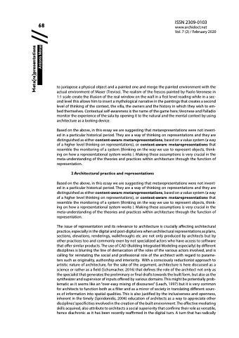 Based on the above, in this essay we are suggesting that metarepresentations were not invent- ed in a particular historical period. They are a way of thinking on representations and they are distinguished as either content-aware metarepresentations, based on a value system (a way of a higher level thinking on representations), or context-aware metarepresentations that resemble the monitoring of a system (thinking on the way we use to represent objects, think- ing on how a representational system works ). Making these assumptions is very crucial in the meta-understanding of the theories and practices within architecture through the function of representation.