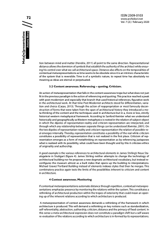 tion between mind and matter (Hendrix, 2011) all point to the same direction. Representational distance allows the dominion of symbols that establish the authority of the architect while ensur- ing his control over what we call architectural space. Distance also effects on the temporalities of contentual metarepresentations as time seems to be obsolete since it is an intrinsic characteristic of the system that is reversible. Time is of a symbolic nature, to repeat time has absolutely no meaning as ideas are eternal or perpetuated.