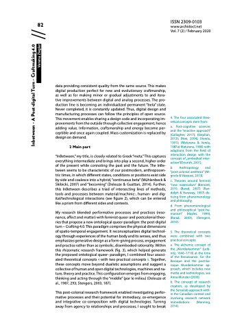 “InBetween,” my title, is closely related to Greek “meta.” This captures everything intermediate and brings into play a second, higher order of the present while connoting the past and the future. The InBe- tween seems to be characteristic of our postmodern, anthropocen- tric times, in which different states, conditions or positions exist side by side and coalesce into a hybrid, “continuous beta” (Mühlenbeck & Skibicki, 2007) and “becoming” (Deleuze & Guattari, 2014). Further, this InBetween describes a triad of intersecting lines of methods, tools and processes between material/machinic-, human- and dig- ital/technological interactions (see figure 2), which can be entered like a prism from different sides and contexts.