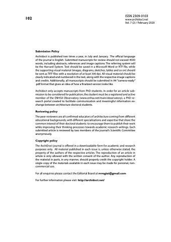 The peer reviewers are all confirmed educators of architecture coming from different educational backgrounds, with different specialisations and expertise that share the common interest of their doctoral students: to encourage them to publish their work while improving their thinking processes towards academic research writings. Each submitted article is reviewed by two members of the journal’s Scientific Committee anonymously.