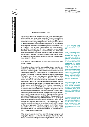 To be different from what has preceded has always been the cor- nerstone of the edifice of architecture as a discipline since the Re- naissance. Even though the value to be different from the obsolete conventional was always utterly important for Architecture, the defi- nition of this value in architectural discourses is somewhat obscure. Prefixes like post-, de-, re-, neo-, appeared as typical signifiers of the spirit of novelty representing the different shifts that shape the his- tory of architecture and could be broadly summarized by the term ‘meta.’ Even if ‘meta’ is an ontological reference to newness implying its definition about what preceded, it has always been polysemic and, for this reason, ambivalent, diffused into the ideas encompassed by the broader term ‘avant-garde’, labeling practices for longer or short- er transitional periods. Architectural design has always been the lab- oratory where experimentation with ideas about the newness of this ‘meta,’ and elaboration of forms and spatial arrangements take place towards architectural creations. Design is always acting between the existing and the upcoming, the established and the expected, the fa- miliar and the xenon, antipathy and empathy. It is driven by the quest for a ‘meta,’ known (or not) that since its appearance, it will lose its newness and will become commonplace. The meta stands for a new condition to be, formulated, structured, and completed. The pursuit of the new empowers architectural design to perform between the old and the meta, in an in-between state, a metaxu state, a fertile ground for change and continuous variation, an interregnum 3 A place to investigate the becoming.