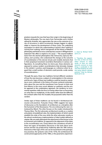 pirations towards the new that have their origin in the beginnings of Western philosophy. The one starts from Parmenides and is further refined by Aristotle, who appreciates the new as the outcome of cy- cles of recurrence in which incremental changes happen to adjust, adapt or improve the development of these cycles. The underlying assumption on which this understanding is based is that “nothing is coming from nothing,” which transgresses all the history of Western philosophy and finds its more contemporary version in Wittgenstein’s statement “the effect is implicit in its cause 5 ” The second tradition starts from the atomist philosophers like Democritus, Epicurus Her- aclitus, and Lucretius, who understood the change as the outcome of recombination of the eternal minute and invisible elements that in their perpetual movement recombine themselves in various con- figurations. As everything flows (τα πάντα ρει), these elements are exposed to various random recombinations that stimulate changes in the existent. Lucretius used language as a reference when he ar- gued that a small number of elements could provide a wide variety of recombinations 6