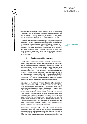 Architecture, as the ultimate inventor of design, is the protagonist in the accomplishment of this aim. Its social project was not only through design to glorify and manifest the superiority of the human intellect spatially but also to change the humans by making them believe in this superiority. To achieve this objective Architecture had to define itself as a design discipline and to produce its own toolkit in a way that both its disciplinary foundations and practices would be compatible and complementary with the under-construction new social, intellectual order. As disciplinary foundations, we mean the ways in which Architecture defines itself as a discipline according to a particular worldview and to a conception of the human into this world. Changes in the contents of the disciplinary fundamentals af- fect the design and how it is spatially manifested.