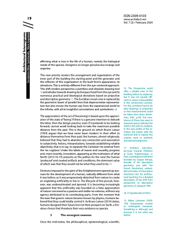 This new priority renders the arrangement and organization of the inner part of the building the starting point and the generator and the reflector of this organization in the built form’s appearance, its elevations. This is entirely different from the eye-centered approach. This shift renders perspective a pointless and obsolete drawing tool 16 and alludes towards drawing techniques freed from the eye and its numerous practical and ideological deviations based on projective and descriptive geometry 17. The Euclidian visual cone is replaced by the geometric beam of parallel lines that depersonalize representa- tion but also moves the human eye from the experienced world to the infinite, with all its insightful connotations and symbolisms 18.