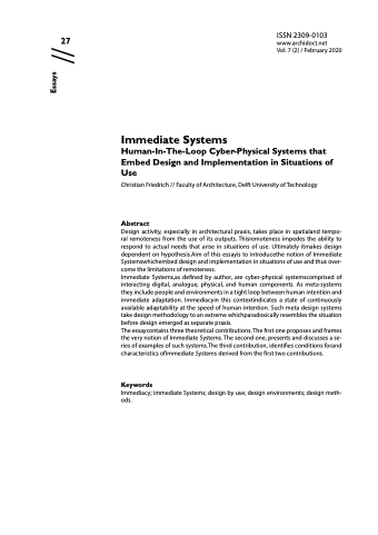 Design activity, especially in architectural praxis, takes place in spatialand tempo- ral remoteness from the use of its outputs. Thisremoteness impedes the ability to respond to actual needs that arise in situations of use. Ultimately itmakes design dependent on hypothesis.Aim of this essayis to introducethe notion of Immediate Systemswhichembed design and implementation in situations of use and thus over- come the limitations of remoteness.