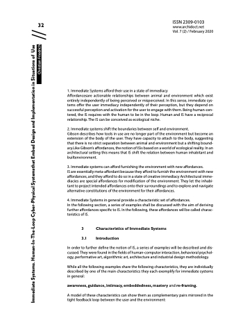 IS are essentially meta-affordant because they afford to furnish the environment with new affordances, and they afford to do so in a state of creative immediacy Architectural imme- diacies are special affordances for modification of the environment. They let the inhabi- tant to project intended affordances onto their surroundings and to explore and navigate alternative constitutions of the environment for their affordances.