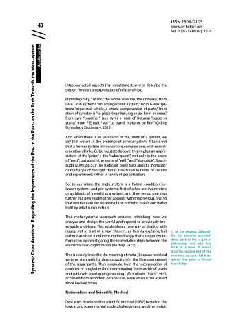 And when there is an extension of the limits of a system, we say that we are in the presence of a meta-system: it turns out that a former system is now a more complex one, with new el- ements and links. Butas we stated above, this implies an appre- ciation of the “prior” + the “subsequent”, not only in the sense of “post”, but also in the sense of “with” and “alongside”. Bourri- aud’s (2009, pp.53) ‘The Radicant’ book talks about a “nomadic” or fluid style of thought that is structured in terms of circuits and experiments rather in terms of perpetuation.