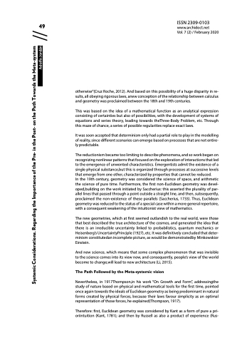 The new geometries, which at first seemed outlandish to the real world, were those that best described the true architecture of the cosmos, and generated the idea that there is an irreducible uncertainty linked to probabilistics, quantum mechanics or Heisenberg’s UncertaintyPrinciple (1927), etc. It was definitively concluded that deter- minism constitutedan incomplete picture, as would be demonstratedby Minkowskior Einstein.