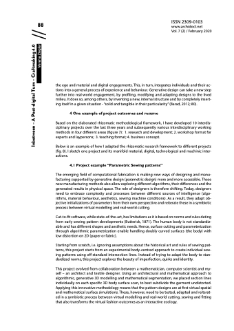 This project evolved from collaboration between a mathematician, computer scientist and my- self – an architect and textile designer. Using an architectural and mathematical approach to algorithmic, generative 3D modelling and mathematical segmentation, we placed section lines individually on each specific 3D body surface scan, to best subdivide the garment undistorted. Applying this innovative methodology means that the pattern designs are at first virtual spatial and mathematical surface simulations. These, however, need to be tested, adapted and reiterat- ed in a symbiotic process between virtual modelling and real-world cutting, sewing and fitting that also transforms the virtual fashion outcomes as an interactive ecology.